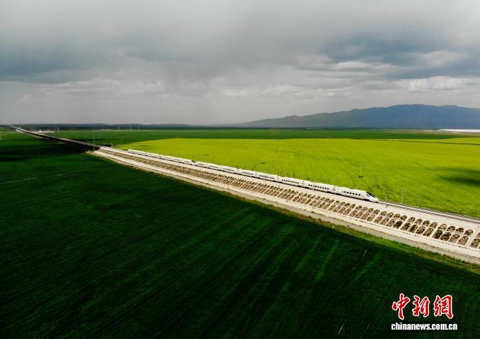 图为兰新高铁动车组列车穿越山丹马场的油菜花海。(资料图)杨艳敏 摄