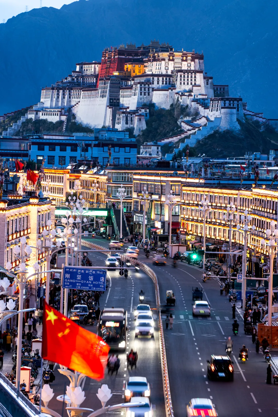 7月14日晚,在西藏拉萨,亮灯后的布达拉宫与北京东路交相辉映,夜色璀璨夺目。
