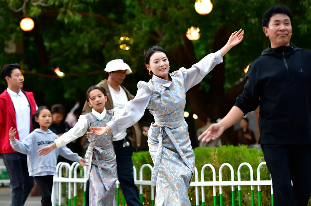 7月13日,西藏昌都澜沧江天津广场上,锅庄舞爱好者踏歌起舞,舞出夏日夜间精彩。