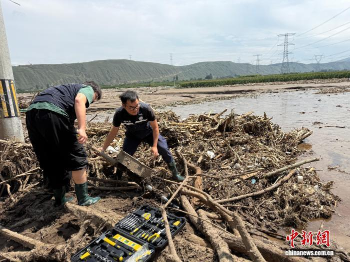 8月8日下午,榆中县气象局工作人员找寻被山洪冲毁的土壤水份站。甘肃省气象局供图