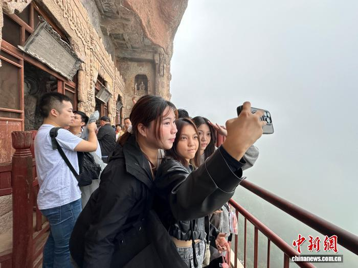 9月2日,图为台青在天水麦积山石窟上打卡拍照。王牧雨 摄