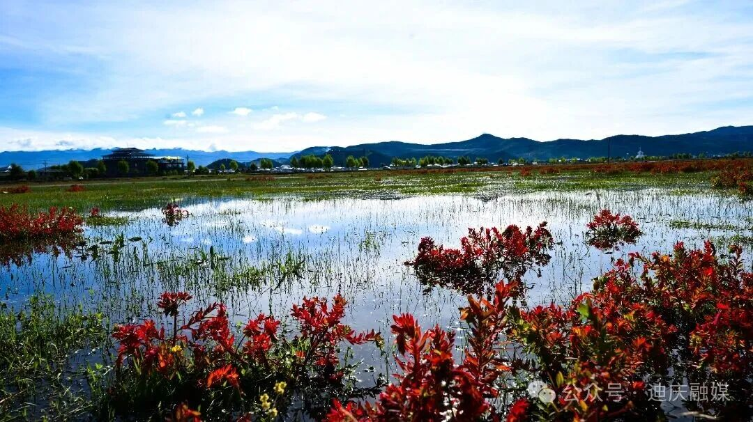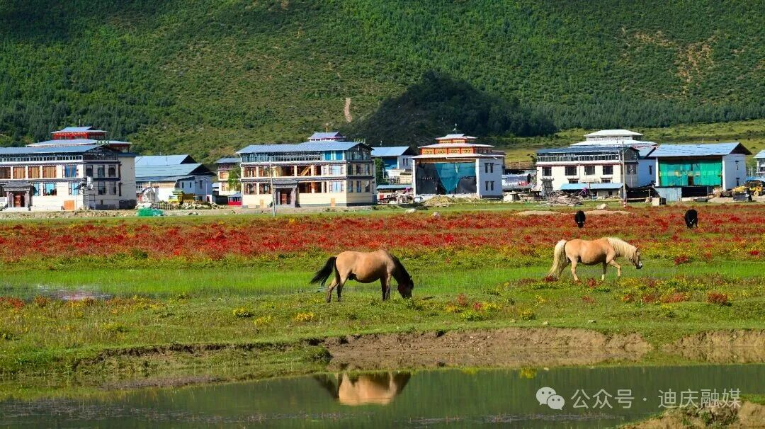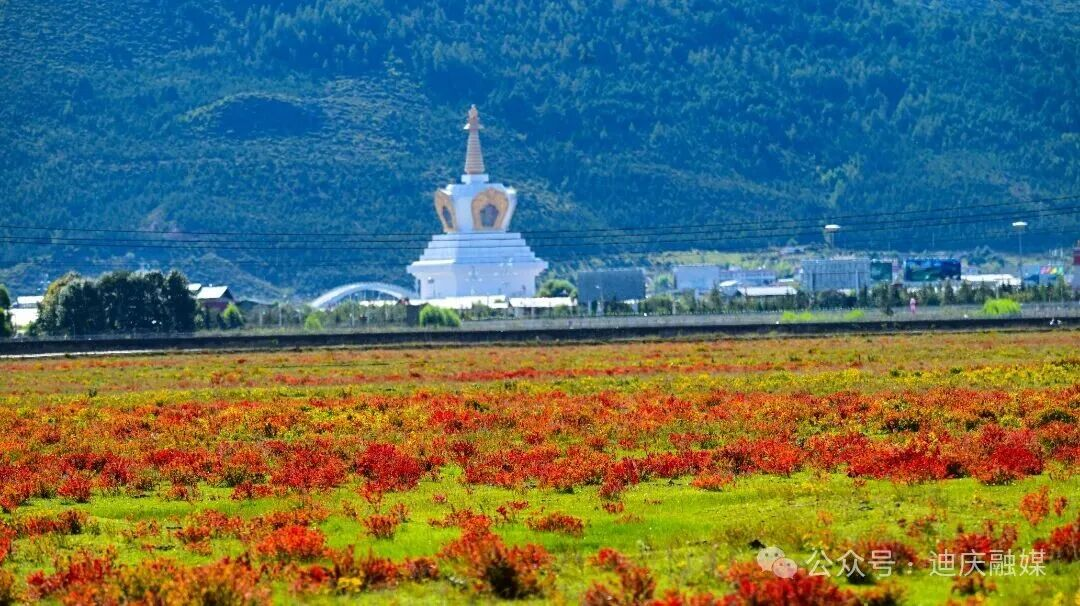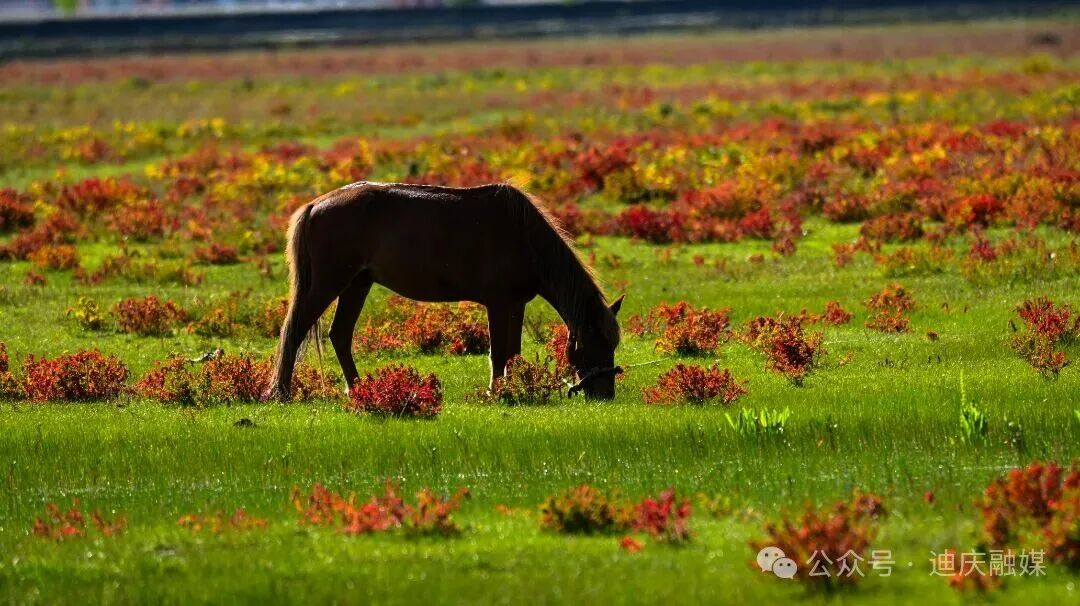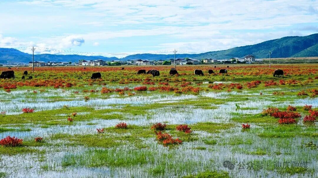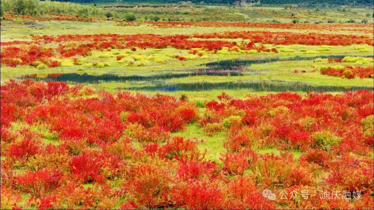 当秋风轻轻扫过草甸的褶皱时,把整座高原攒了一夏的炽热,酿成一场裹着甜香的绯红相遇。草坝子悄悄换下了盛夏的绿裙——不是渐变的黄,是被狼毒花染透的绯红。它像是一位姑娘路过时,不小心泼翻了妆匣里的胭脂,顺着草甸的褶皱漫开,把整座高原的秋意都扮成了赤金点染般的妆。