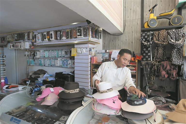 科杰加措在整理铺子里的商品。