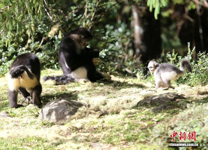 10月6日,滇金丝猴国家公园内三只滇金丝猴在玩耍。黄兴鸿 摄