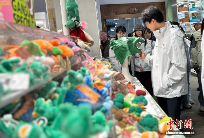 10月11日,“大手牵小手·丝路一起走”第三届澳门青少年国情研学活动在甘肃进行。图为澳门学子驻足观赏甘肃省博物馆的“绿马”文创。中新社记者 闫姣 摄