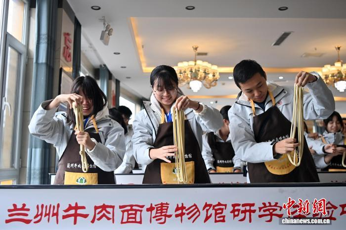 走进兰州牛肉面博物馆,浓郁的面香扑面而来。展柜里陈列的各色调味品,仿佛在“预告”一碗牛肉面的诞生。学子们穿上围裙、撸起袖子,化身“拉面师傅”,在老师的指导下尝试拉面。“细面要拉得均匀,宽面得掌握好力度,越紧张越容易断!”有学子一边摸索技巧,一边用镜头记录下自己扯出的第一缕面,还计划剪辑成视频,分享到社交平台,让更多人看见“兰州味道”。