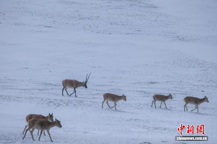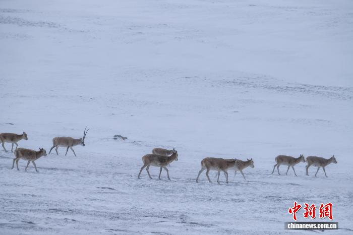 近日,中新网记者在西藏自治区阿里、那曲等地记录到藏羚羊群活动影像。画面中,藏羚羊群或低头觅食,或结伴而行,在高原的雪原与草原之间勾勒出和谐画卷。据悉,近年来,西藏藏羚羊种群规模一直持续扩大。2024年西藏自治区生态环境厅发布的《2023西藏自治区生态环境状况公报》显示,西藏境内藏羚羊数量增长到30多万只。图为10月9日,在西藏阿里地区拍摄到的藏羚羊群。江飞波 摄
