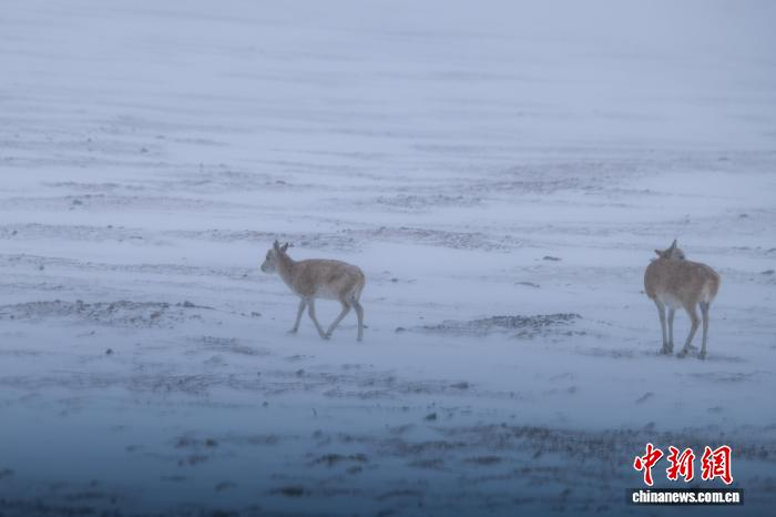 图为10月9日,在两只藏羚羊在雪原中觅食。江飞波 摄