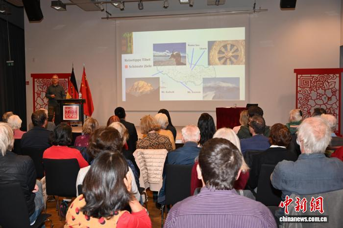 图为米福热情洋溢地介绍中国西藏。柏林中国文化中心 供图