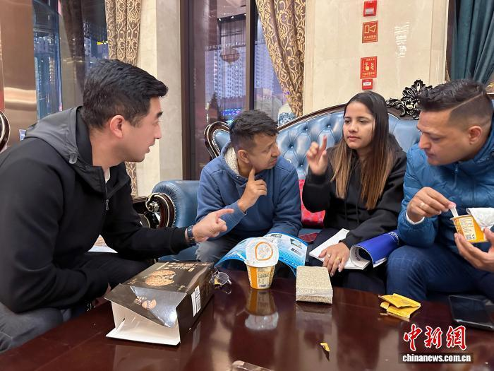 10月16日,甘肃省民贸民品企业家临夏行座谈会举行,活动期间,甘肃临夏州企业家(左一)向尼泊尔企业家介绍当地特色农产品。艾庆龙 摄