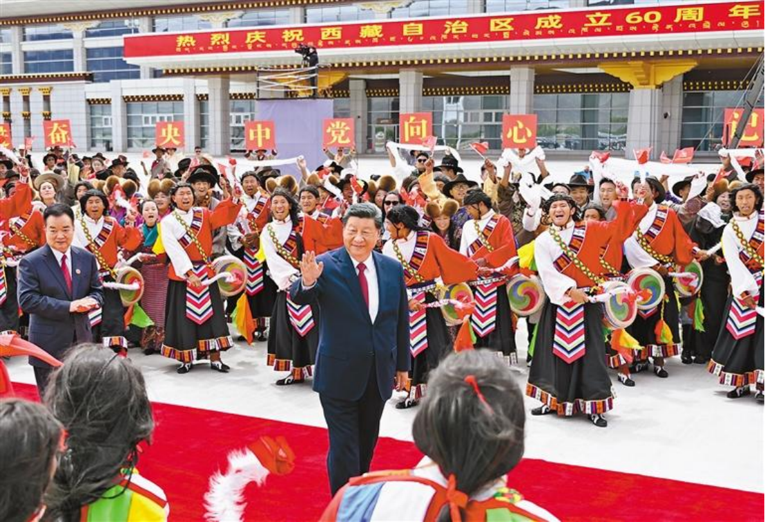 ཞི་ཅིན་ཕིང་བོད་ནས་ཞལ་གྱེས་སྐབས། མི་རིགས་ཁག་གི་མང་ཚོགས་ཚོས་ལྷ་སའི་གྲོང་ཁུལ་ཁག་གི་ལམ་གཡས་གཡོན་གཉིས་སུ་འཛོམས་ཏེ་དར་དམར་གཡུག་གཡུག་བྱེད་པ་དང་ལག་ཏུ་མཇལ་དར་ཁྱེར་ནས་སྤྱི་ཁྱབ་ཧྲུའུ་ཅིར་མགྲིན་གཅིག་ཏུ་དགའ་འབོད་བྱས་ཏེ་སྤྱི་ཁྱབ་ཧྲུའུ་ཅིར་སེམས་གཏིང་ནས་བཅངས་པའི་དགའ་གུས་གང་ལེགས་མཚོན་པར་བྱས་ཡོད། ལྷ་སའི་གོང་དཀར་གནམ་ཐང་དུ་དུས་ཆེན་གྱི་གཟབ་མཆོར་ལེགས་པར་སྤྲས་པའི་ལས་བྱེད་པ་དང་མང་ཚོགས་ཚོས་དར་དམར་དང་མེ་ཏོག་གཡུག་གཡུག་བྱེད་པ་དང་། གླུ་ལེན་གར་འཁྲབ་བྱས་ཏེ་སྐད་གསང་མཐོན་པོས་བཀྲ་ཤིས་བདེ་ལེགས་ཞེས་ཞུས་ནས་ས་མཐོའི་བུ་ཕྲུག་ཚོས་བློ་མཐུན་ཞི་ཅིན་ཕིང་གིས་སྲོག་ཤིང་གནང་བའི་ཏང་ཀྲུང་དབྱང་ལ་བཀའ་དྲིན་ཚོར་སེམས་དང་སྤྱི་ཚོགས་རིང་ལུགས་དེང་རབས་ཅན་གྱི་བོད་ལྗོངས་གསར་པ་འཛུགས་སྐྲུན་གྱི་ཡིད་ཆེས་བརྟན་པོ་མཚོན་པར་བྱས་ཡོད་པ་རེད།