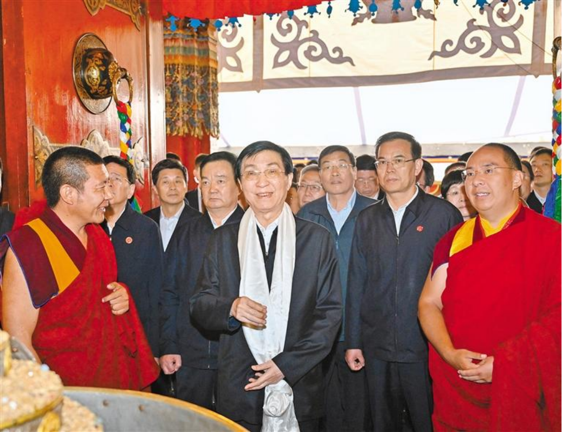 ཟླ་8ཚེས་23ཉིན་གྱི་སྔ་དྲོར། སྤྱི་ཁྱབ་ཧྲུའུ་ཅི་ཞི་ཅིན་ཕིང་གི་བཀའ་མངགས་ལྟར། ཏང་ཀྲུང་དབྱང་གི་བྱམས་བརྩེའི་ཐུགས་ཁུར་དང་རྒྱལ་ཡོངས་མི་དམངས་ཀྱི་སྨོན་འདུན་བཟང་པོ་བསྣམས་ནས། ཀྲུང་དབྱང་སྐུ་ཚབ་ཚོགས་པའི་ཁོངས་མི་ཁག་གཅིག་གིས་གཞིས་རྩེར་མི་རིགས་ཁག་གི་ལས་བྱེད་པ་དང་མང་ཚོགས་ལ་འཚམས་འདྲི་གནང་ཞིང་། འདི་ནི་ཝང་ཧུའུ་ཉིང་དང་ཀྲུང་དབྱང་སྐུ་ཚབ་ཚོགས་པའི་ཁོངས་མི་ཁག་གཅིག་གིས་བཀྲས་ལྷུན་དགོན་དུ་ཕེབས་ཏེ་ཆོས་ལུགས་ལས་རིགས་ཀྱི་མི་སྣར་འཚམས་འདྲི་གནང་བཞིན་པ།