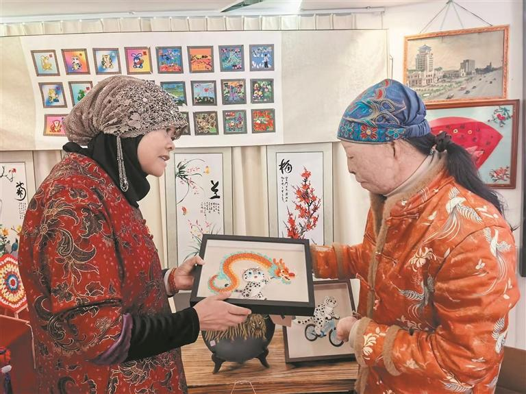 一句邀请,为叶启莲推开了一扇通往“娘家”的大门,也走进了这个由汉、回、藏、土、撒拉等多民族姐妹组成的大家庭。尽管民族不同、绣法各异,可聚到一起,大家就有聊不完的话题。你教我盘线,我帮你配色,连午饭都凑在一起吃——回族的面片、撒拉族的点心……摆在一起就是一桌热闹的“团结饭”。