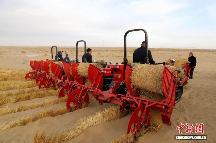 深秋时节,甘肃省武威市民勤县沙咀墩规模精准固沙造林示范区的流沙之上,一台橙黄色的“治沙利器”正依托双履带平稳推进。随着液压装置有力下压,麦草被深深扎进沙层,机械行进间,铺草、压草、划线一系列工序行云流水。