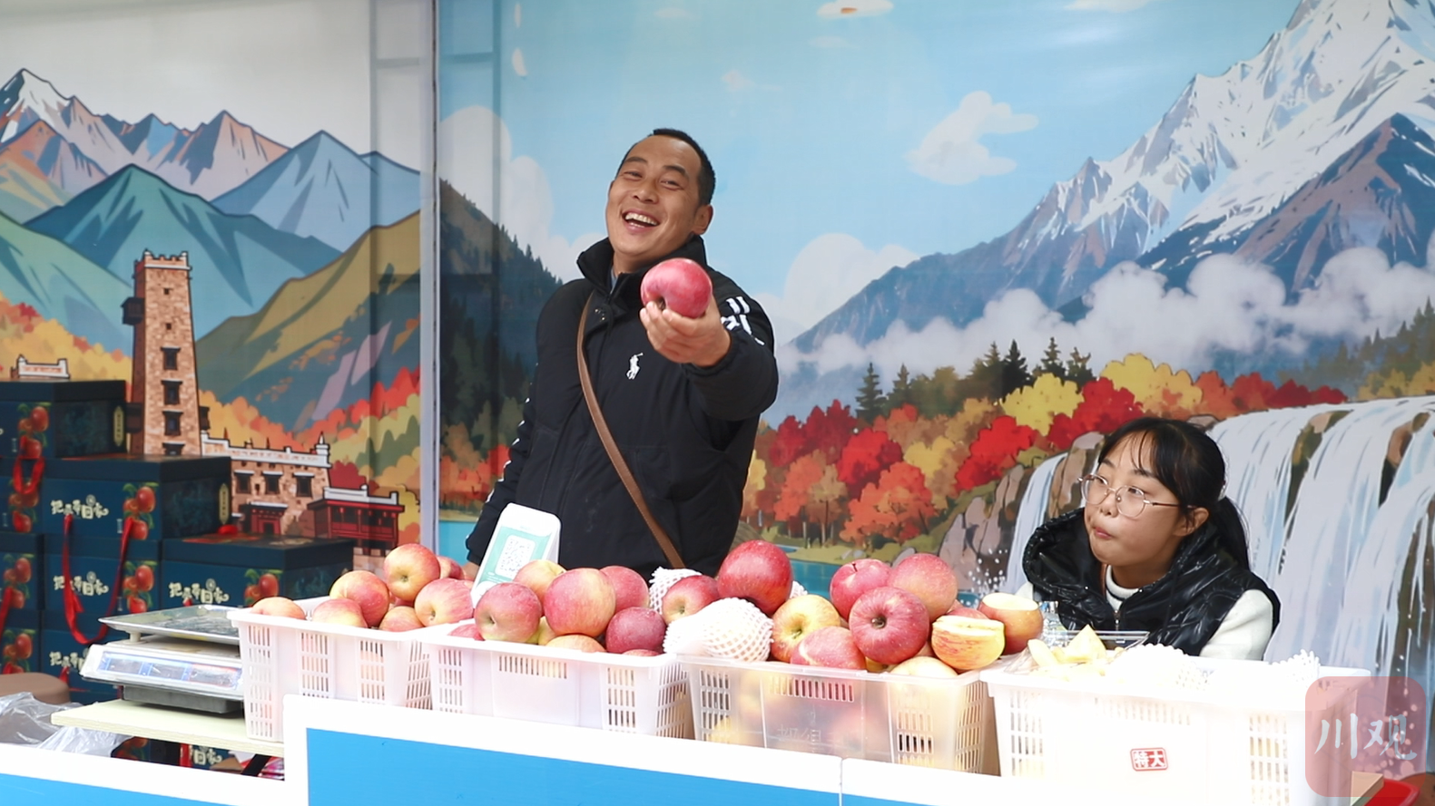 茂县摊主邀请球迷品尝苹果。 刘文佳 摄