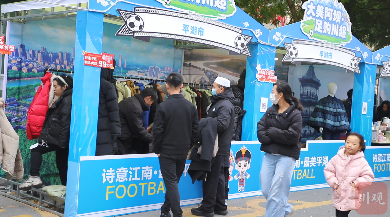 值得一提的是,对口帮扶茂县的浙江省平湖市也来到了阿坝队主场外设点。“我们带了几十个品类的产品来到茂县参加展销活动。羽绒被、箱包是平湖市的代表性产品,今天球迷最喜欢用消费券买的产品是羽绒服。”平湖市商务局相关负责人说。