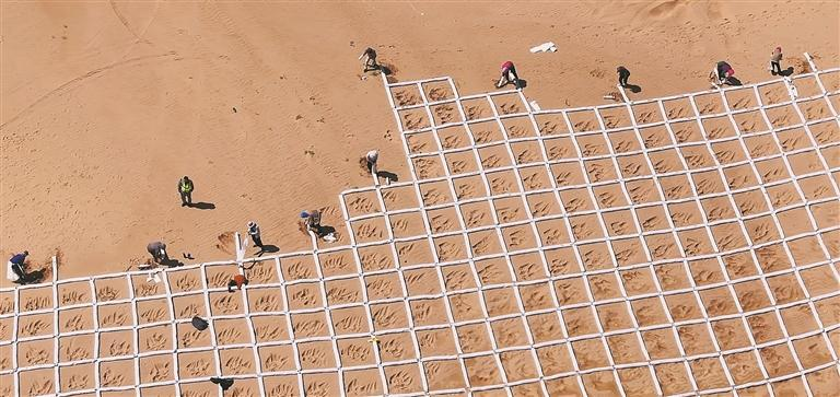 治沙现场,机械化压沙设备履带碾过之处,松散沙层被快速平整压实,为后续固沙筑牢基础;多地创新使用的双网膜沙障铺设机像精密织机,将新型复合网膜匀速铺展,机械手臂精准压边固定,短短一小时就能完成数名工人一天的工作量……