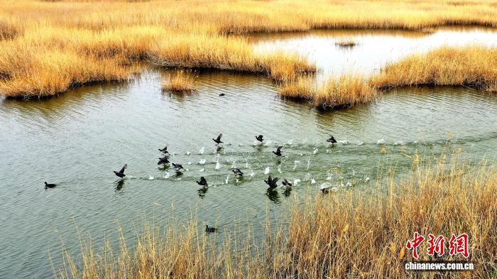 初冬时节,位于甘肃省武威市民勤县境内的民勤石羊河国家湿地公园,芦荡与浅滩相映成趣,洲渚之上百羽翔集。