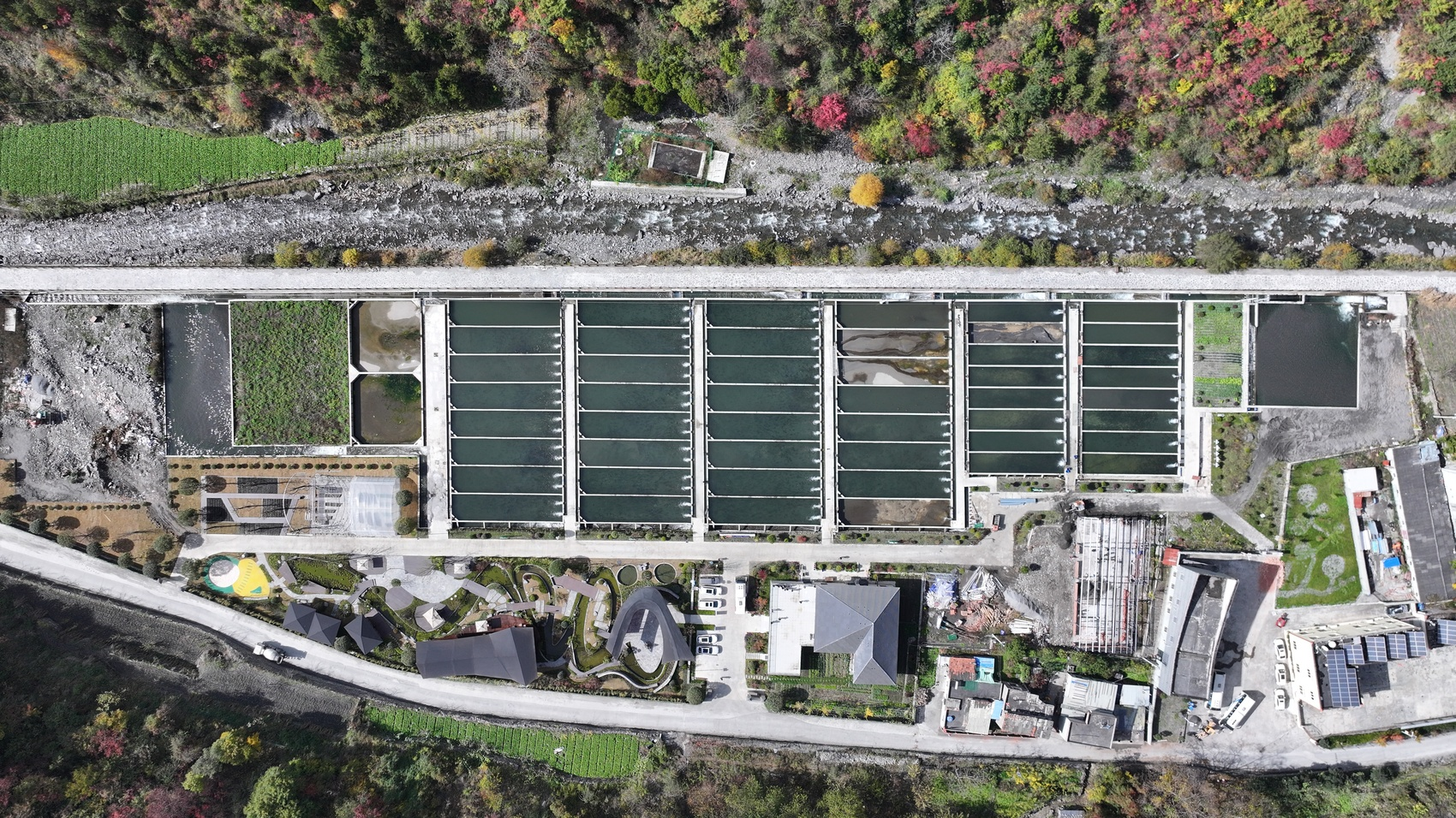 一路行来,河谷渐窄,林荫蔽日,快至地图“甲米村”标识处豁然开朗——50余口标准化流水养殖池沿河而建,如梯田般层层铺展,与远处的雪山、近处的森林相映成景。这片占地40亩的理县高原特色冷水鱼产业基地,是阿坝藏族羌族自治州首个规模化冷水鱼养殖基地。