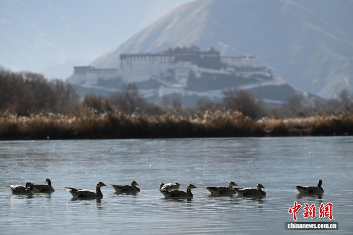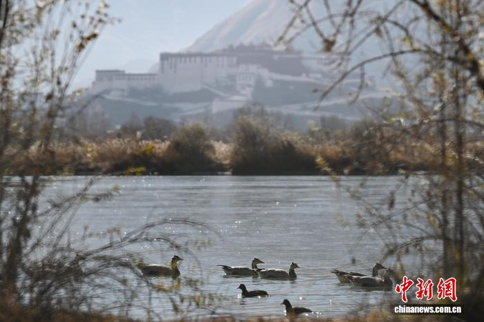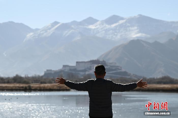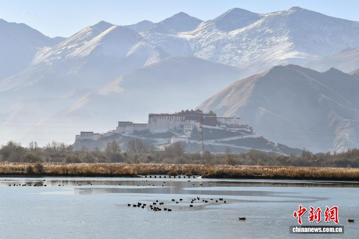 2025年12月9日,世界海拔最高的城市内陆天然湿地——拉萨拉鲁湿地国家级自然保护区尽显冬日盛景。这片总面积12.2平方公里的“拉萨之肺”,初冬时节芦苇泛金,赤麻鸭、斑头雁等候鸟在此嬉戏觅食。远处布达拉宫巍然矗立,周边雪山皑皑,自然生态与人文景观交相辉映,构成一幅兼具壮阔与灵动的高原画卷,彰显着拉萨人与自然和谐共生的生态之美。图为拉萨市民在拉鲁湿地晨练。中新社记者 贡嘎来松 摄