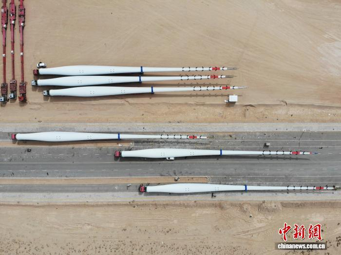 4月23日,航拍位于甘肃省武威市民勤县的甘肃远景能源有限公司运输完成制造的智能风机叶片。李亚龙 摄