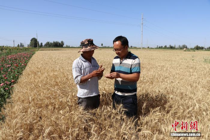 图为民勤县农技人员开展小麦测产调研,现场评估作物质量。(资料图)马爱彬 摄